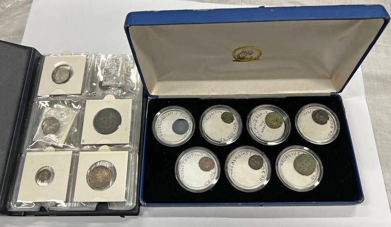 Album of assorted metal detectorists finds to include hammered coins including cut fractionals, roman & other later coins & a cased set of roman cons for valentian & others