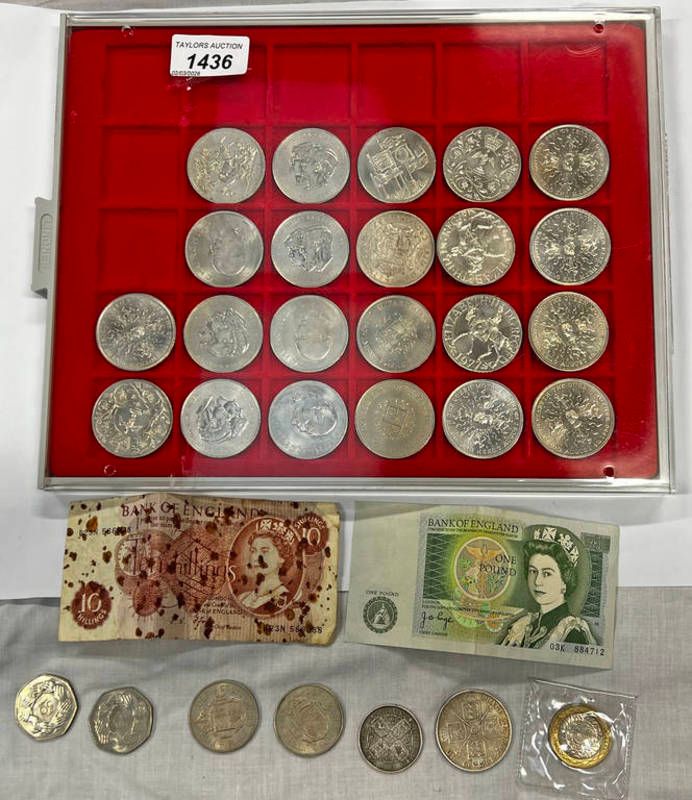 22 crowns, 1889 silver double florin, one florin, bank of england one pound & 10 shilling notes, etc