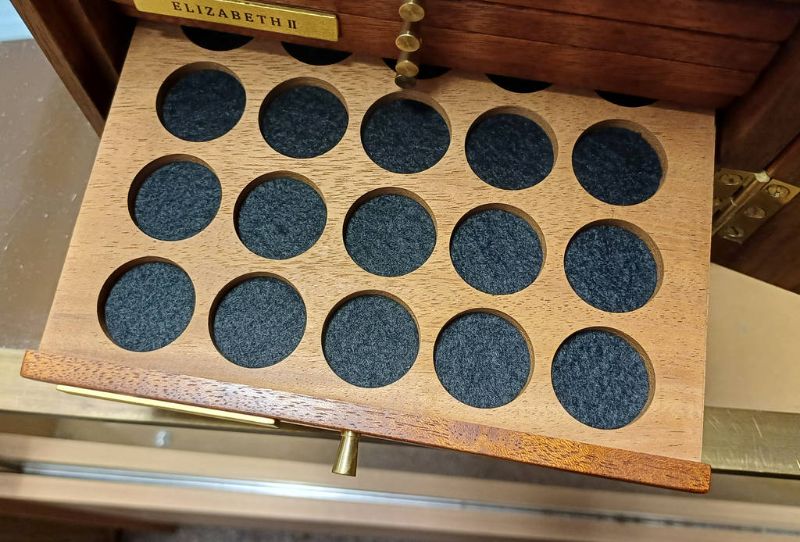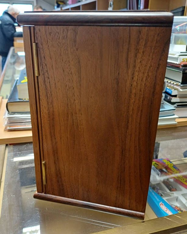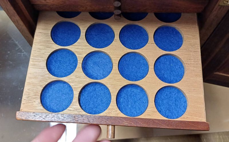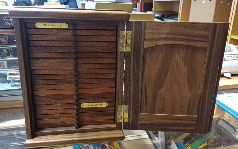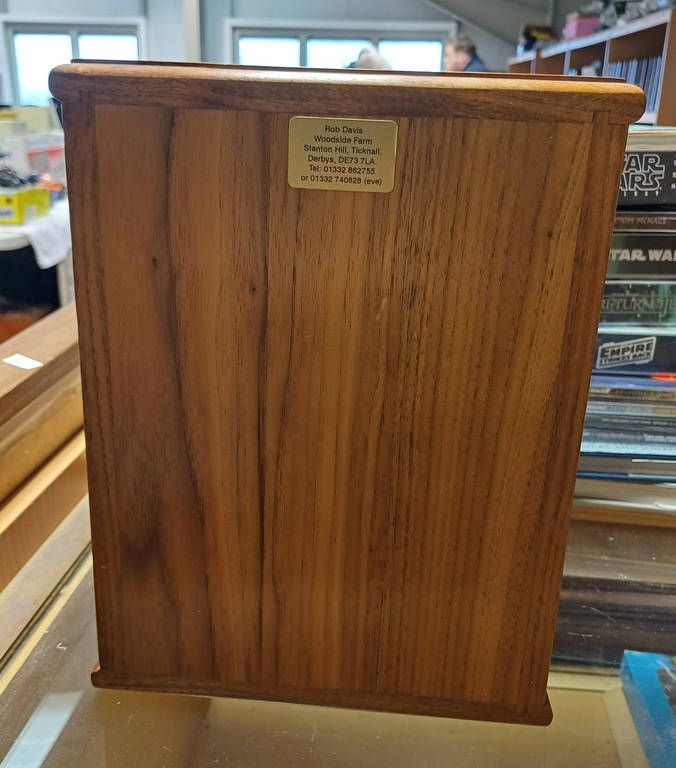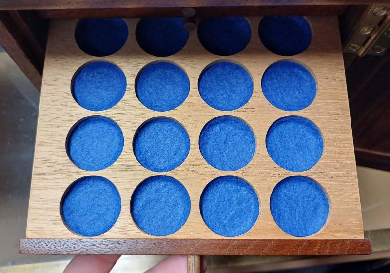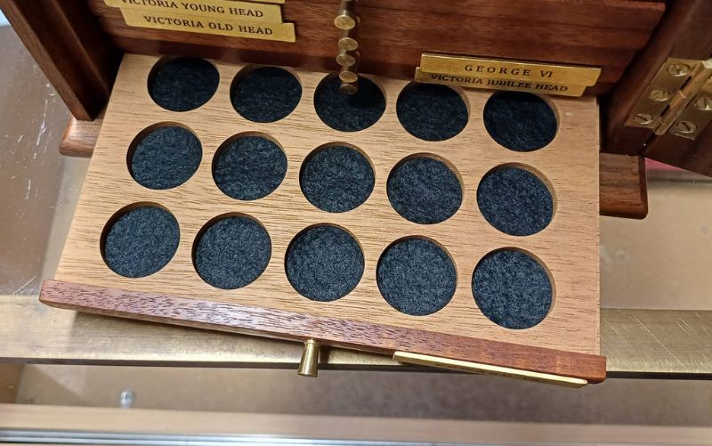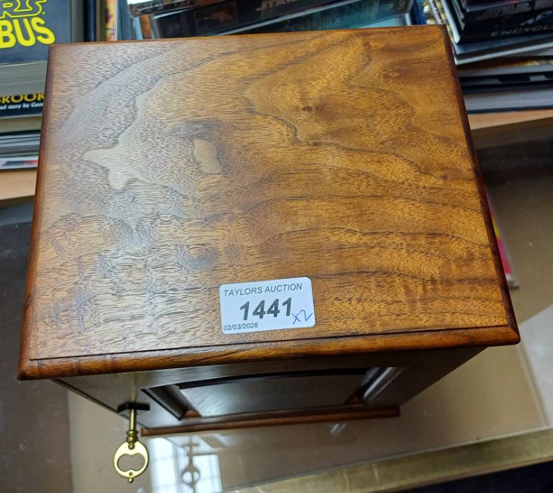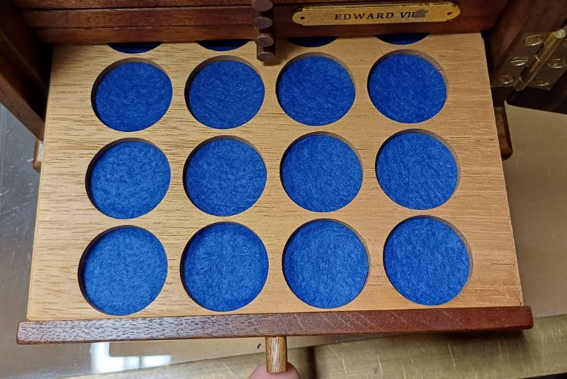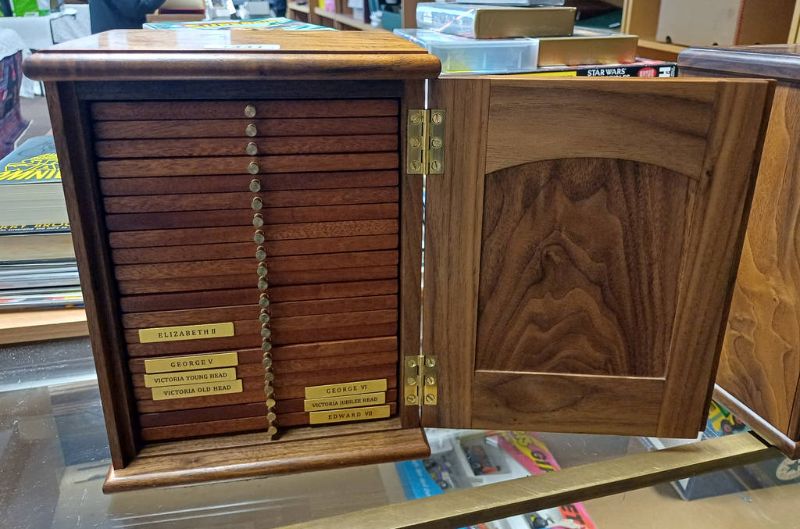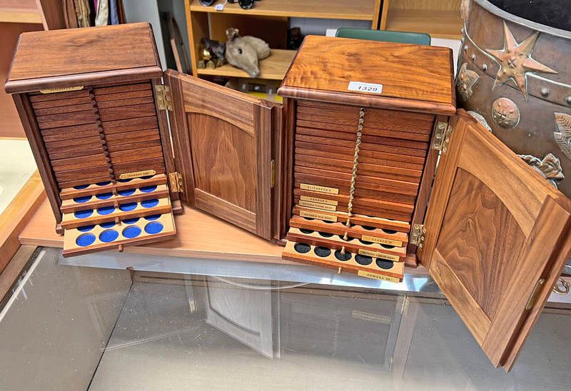 2 x coin collectors cabinets, first suitable for shilling size and lower, the second sixpence and lower, one walnut with 21 drawers - 27 cm high x 20 cm wide x 17 cm deep and the other walnut with 20 x drawers - 26 cm high x 19 cm wide x 17 cm deep, one with lock and key, the other missing key, however the one key fits both locks