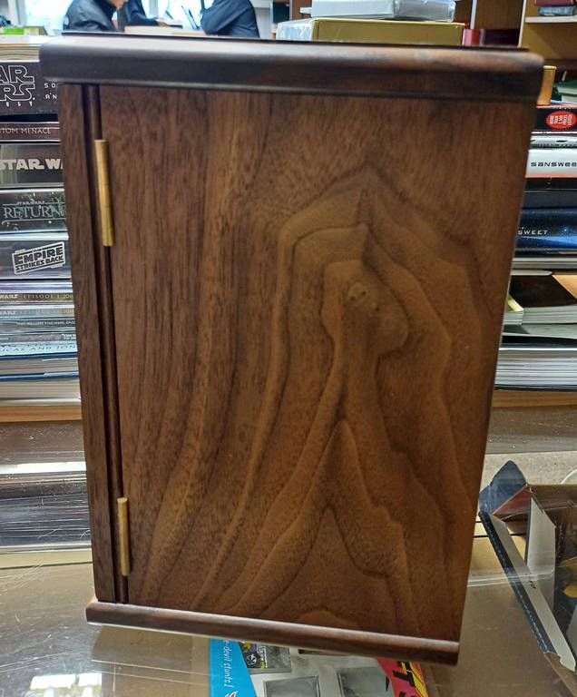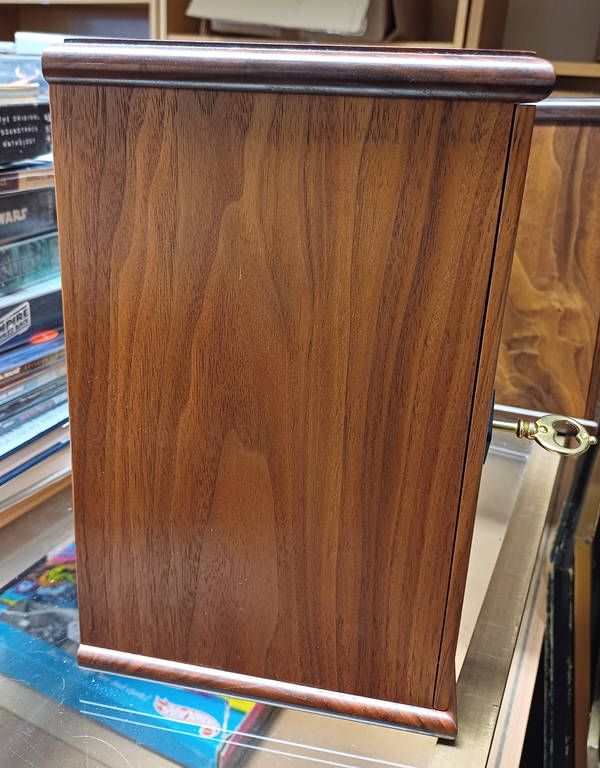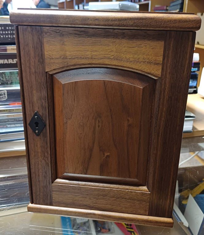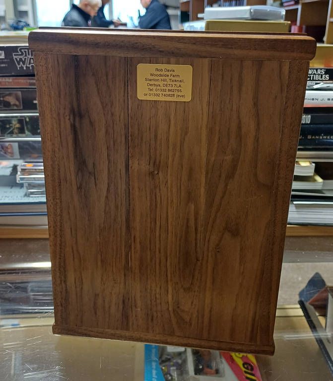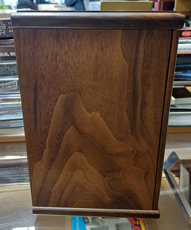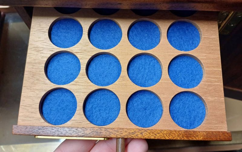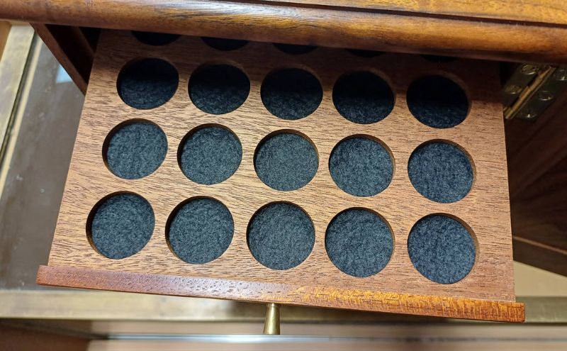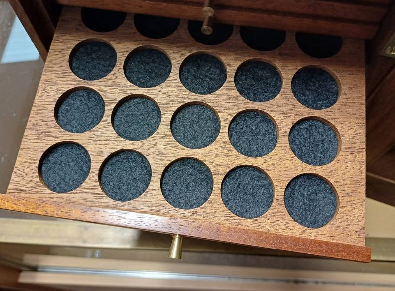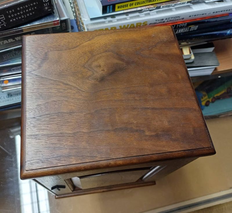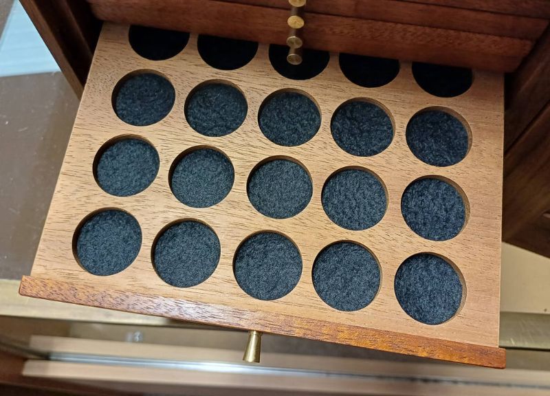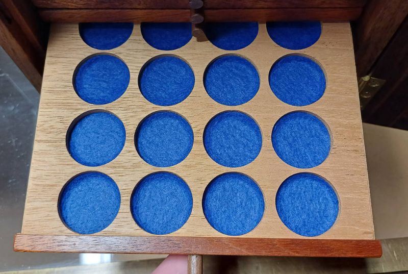 2 x coin collectors cabinets, first suitable for shilling size and lower, the second sixpence and lower, one walnut with 21 drawers - 27 cm high x 20 cm wide x 17 cm deep and the other walnut with 20 x drawers - 26 cm high x 19 cm wide x 17 cm deep, one with lock and key, the other missing key, however the one key fits both locks