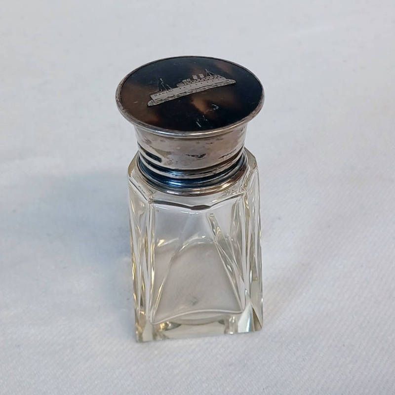 Silver & tortoiseshell mounted scent bottle with inset to lid depicting s.s ranchi - 7cm tall