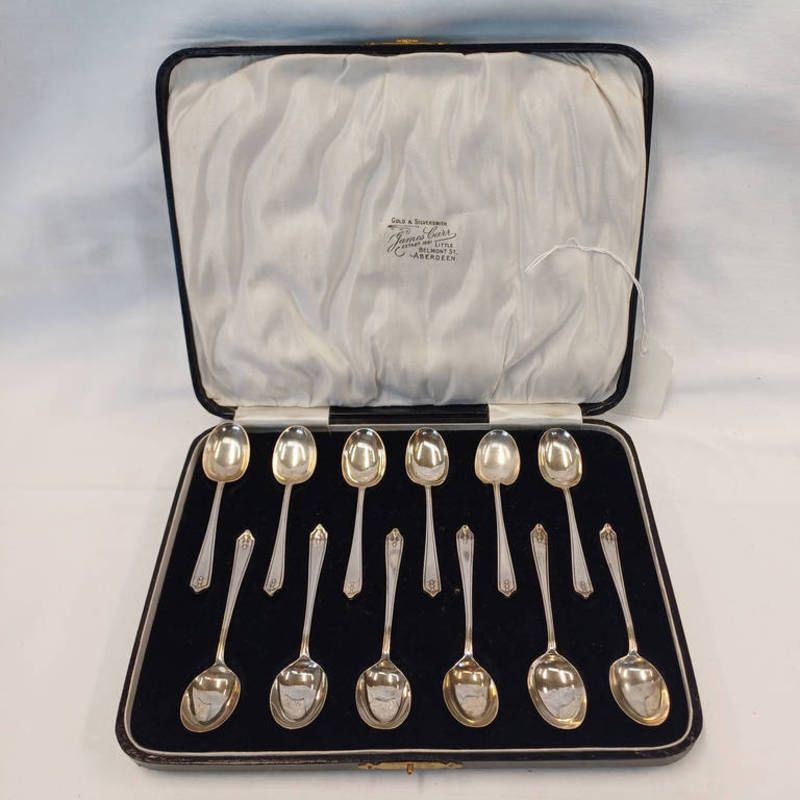 Set of 12 cased silver teaspoons by barker brothers silver ltd, birmingham 1928. 115g