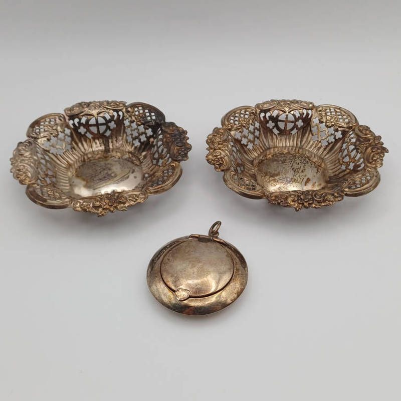 Silver pill box with lift-up lid, birmingham 1897 2 silver dishes total weight 55g