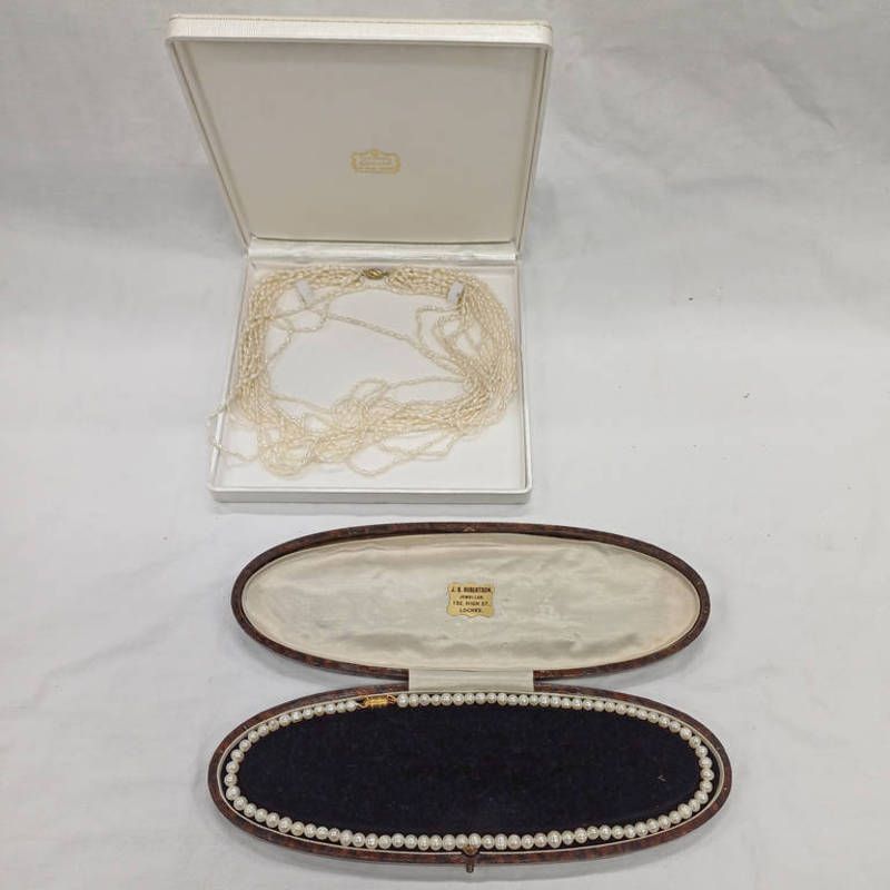 Pearl necklace on screw clasp. length 46 cms & a multi strand pearl necklace on a 14ct gold clasp - length 49 cms