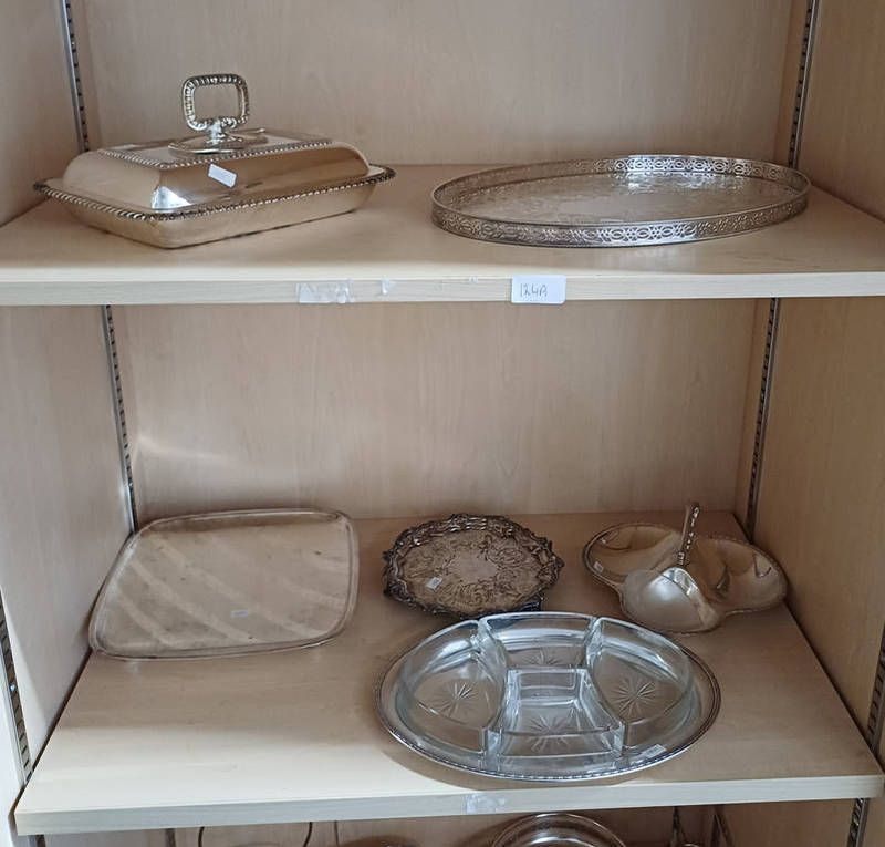 Selection of silver plate to include entree dish, salver etc over 2 shelves