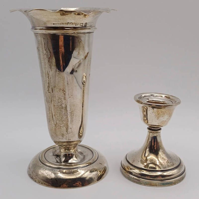 Silver tapering vase & silver dwarf candlestick. weighable silver 80g. vase 13 cm tall