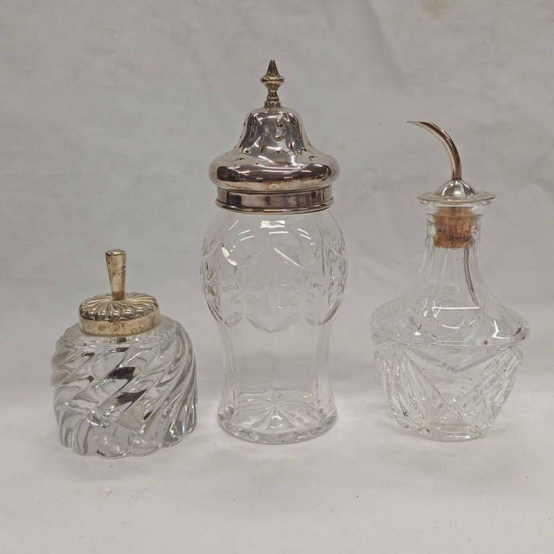 Cut glass scent bottle with silver pourer, birmingham 1937, silver topped cut glass, sugar sifter, silver topped cut glass jar