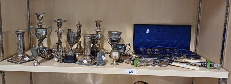 Selection of silver plated ware including candlesticks, trophies, flatware etc on one shelf