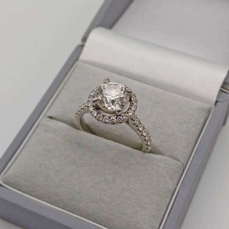 Diamond single stone ring, the round brilliant cut diamond approx. 2.04 carats set within a surround of brilliant cut diamonds. the principal diamond colour: k, clarity si. with anchorcert certificate
