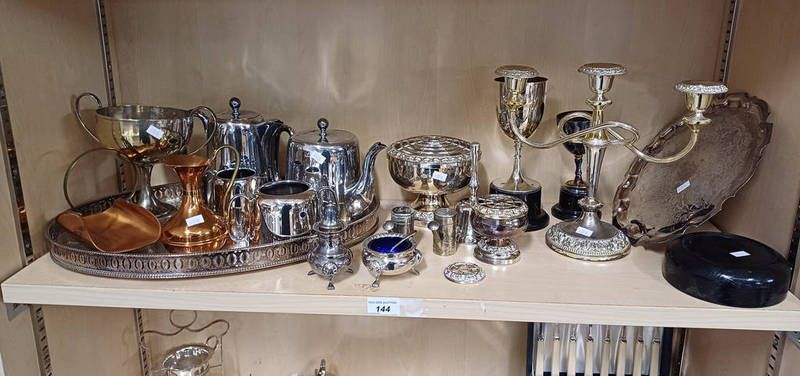 Selection of silver plated ware including teaset, candleabra, gallery tray etc on one shelf