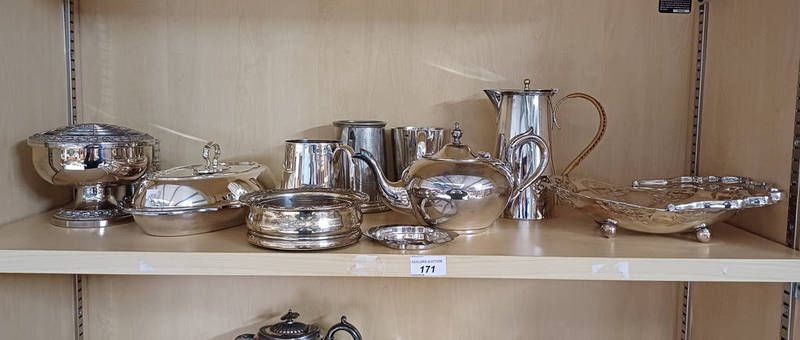 Selection of silver plated ware including tankards, entree dish, wine slide etc on one shelf
