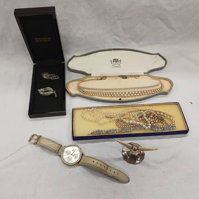 Hilfiger multi dial wristwatch, pearl necklace on sterling silver clasp, marcasite set bracelet & brooch, silver marcasite set clip brooch, silver mounted pen rest, sheffield 1905