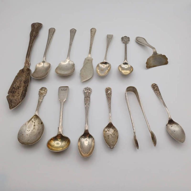 Selection of silver including caddy spoon, birmingham 1969, mustard spoon, london 1836, tongs, 2 jam spoons, butter knife, sterling silver pusher, etc total weight 226 grams