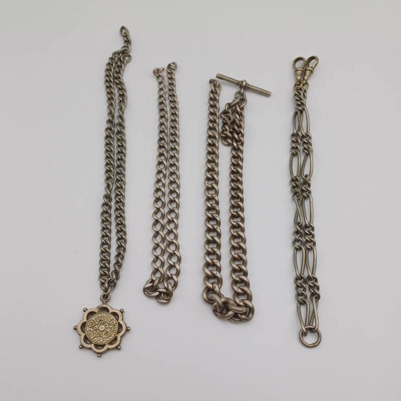 Silver albert chain 36 grams, 1 other silver watch chain & 2 other albert chains. largest 94 grams. weighable silver
