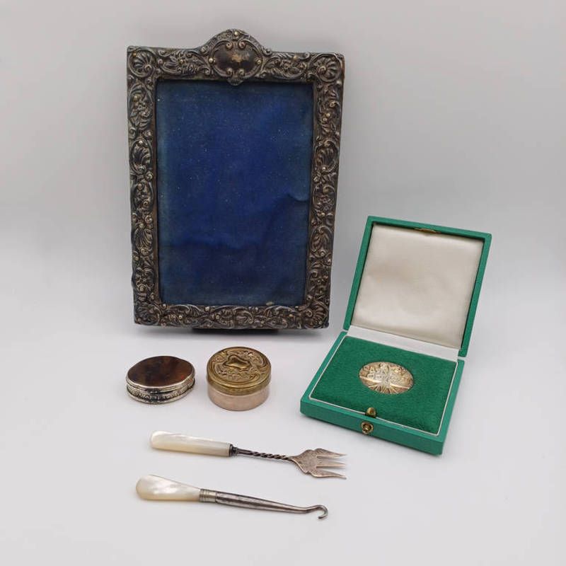 Silver pickle fork with mother of pearl handle, sheffield 1899, button hook with mother of pearl handle, oval box marked 800, medallion marked grvn 80 basel, silver frame , birmingham 1898 9.5 x 14cm