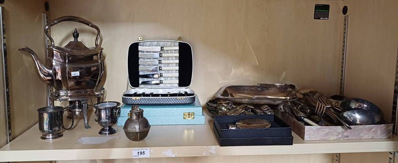 Selection of silver plated ware including spirit kettle, jersey milk can, cutlery etc on one shelf