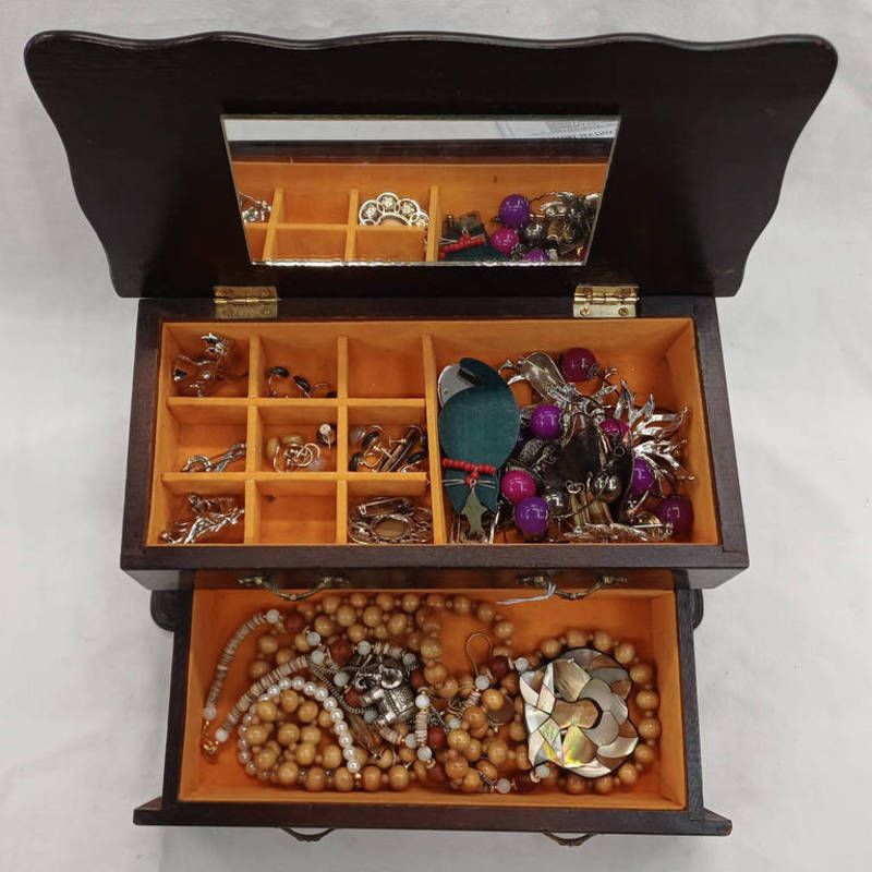 Wooden jewellery box with lift up lid and contents of various jewellery brooches, earrings, necklaces etc