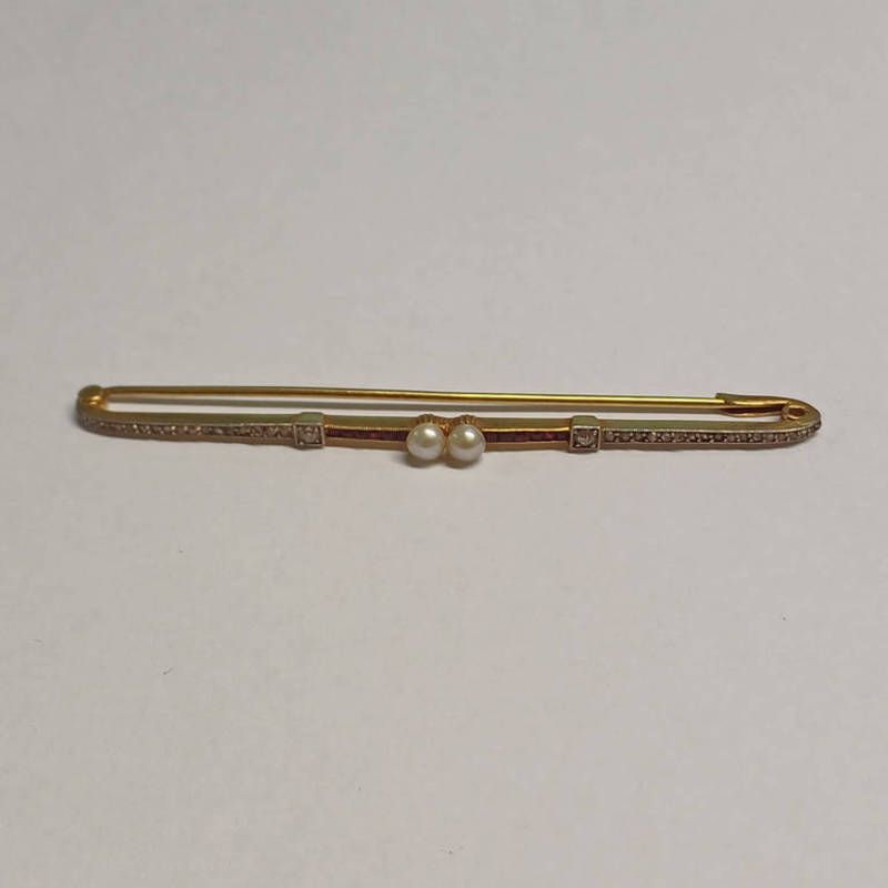 Early 20th century gold pearl, ruby & diamond brooch, the 2 central pearls set between calibre cut rubies & rose cut diamonds - 8cm long, 5.8g