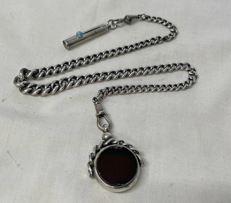 Silver watch chain with silver swivel fob & silver turquoise set retractable pencil