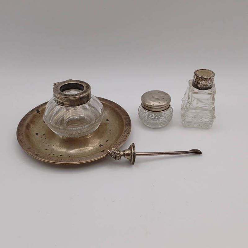 Silver punch head snuff spoon, birmingham 1898, silver circular stand and silver topped bottle, silver topped cut glass jar, silver rimmed cut glass jar.- weighable silver 67g