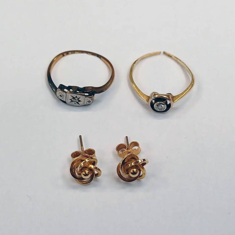 18ct gold diamond set ring with damaged shank - 1.4g, 9ct gold ring 1.3 grams & pair 9ct gold earrings - 1.5 grams