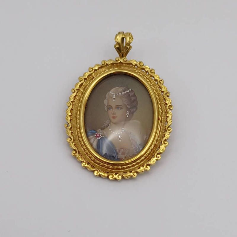 18ct gold mounted brooch/pendant with portrait miniature of a young lady set with gem set necklace, earring & brooch - weight 13.4 grams