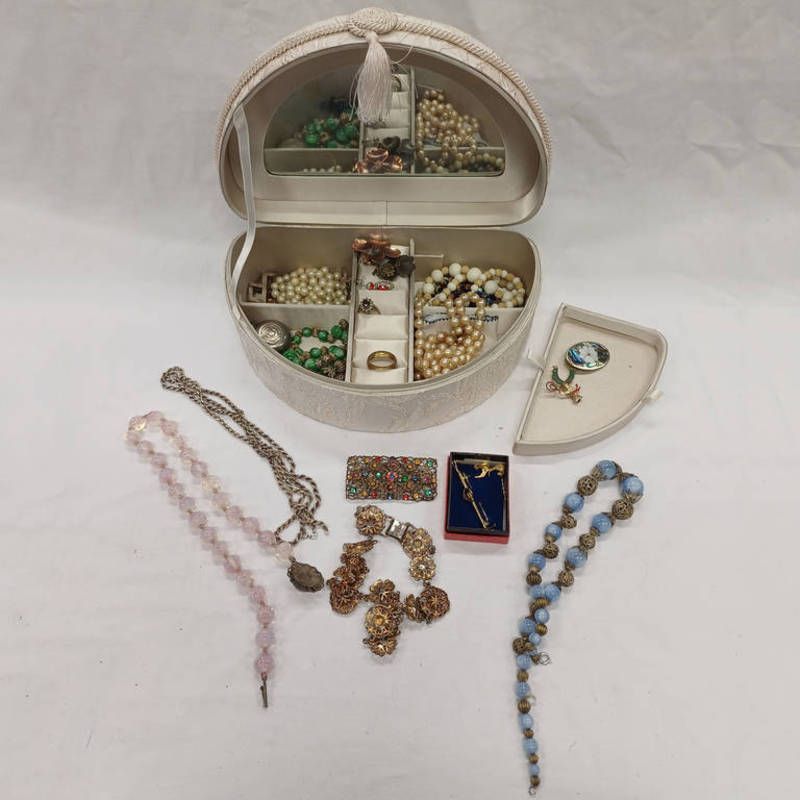 Marbled cowboy brooch, oval alpaco mother of pearl brooch, coin holder, silver rings, silver chain 39 grams etc in oval jewellery box
