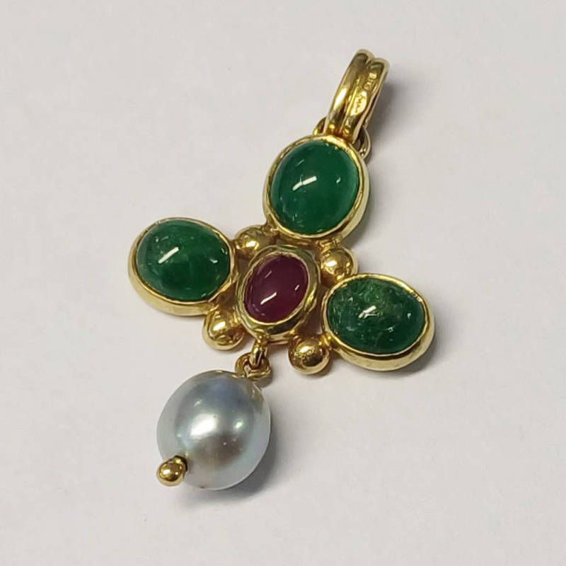 18ct gold cross pendant set with cabochon ruby & emeralds with baroque pearl below - 4cm long, 6.5g