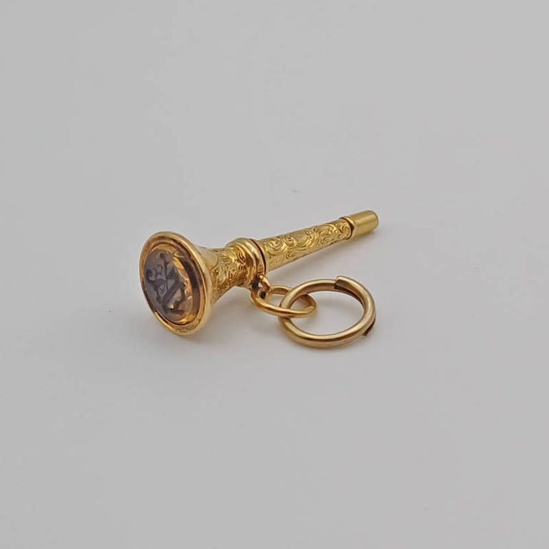 19th century gold mounted watch key with foliate engraved decoration & intaglio seal terminal