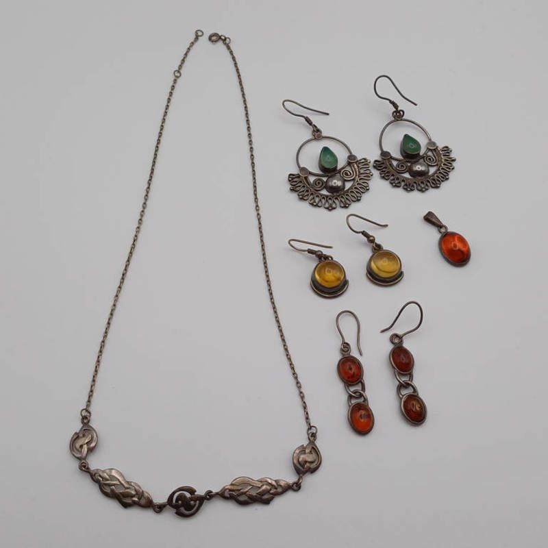 2 pair silver ear pendants & pair of matching silver & amber earrings, silver arts & crafts necklace. length 46 cms