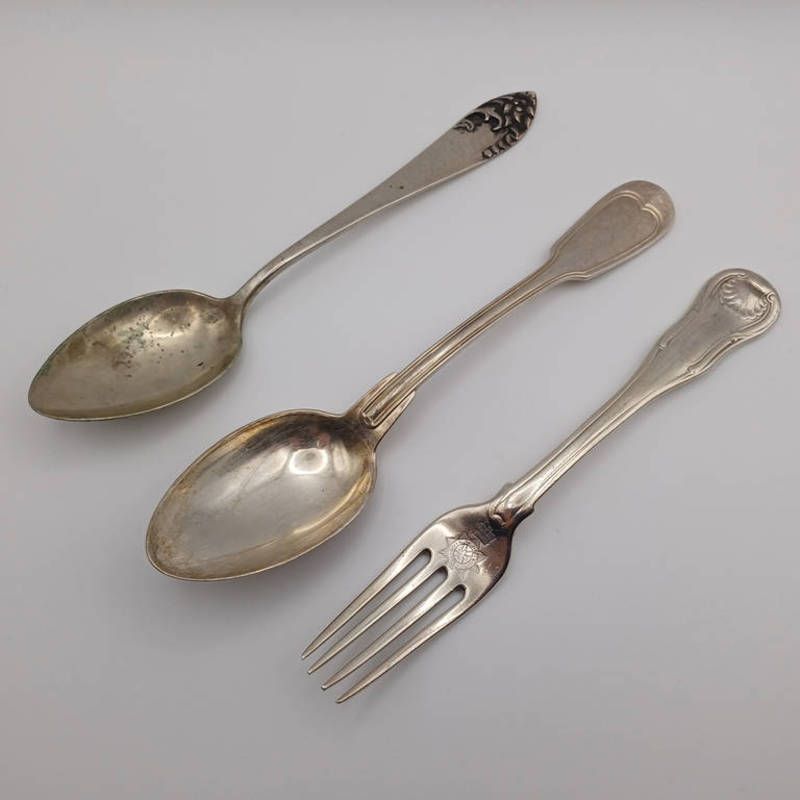 White metal table spoon with stamped mark 800 pk, white metal table spoon marked 84, hallmarked silver table fork. total weight 238 grams