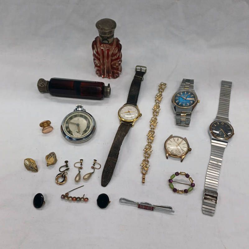 Various wristwatches by oriosa, eloga, & timex, chrome ingersoll pocket watch, costume jewellery & 2 cut glass scent bottles