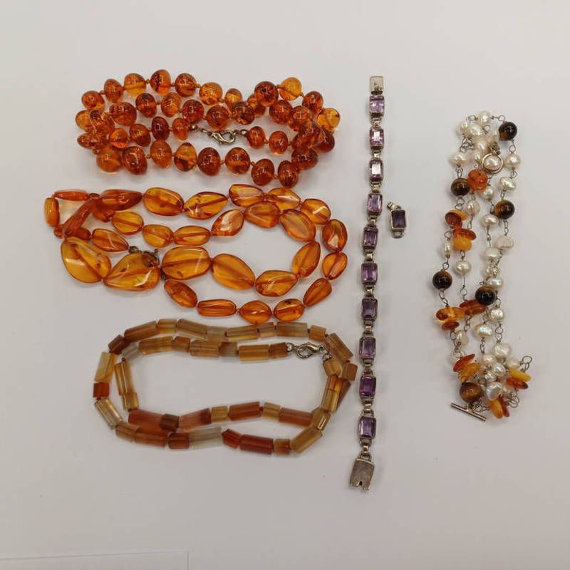 2 amber necklaces, one other necklace, silver set pearl & amber bracelet, 18 cms & silver gem set bracelet, 17cm with spare link