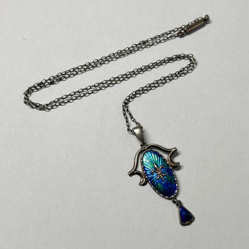Early 20th century silver & enamel pendant on chain with stylised fleur de lys to centre by charles horner, chester 1912-4.5cm long including bale