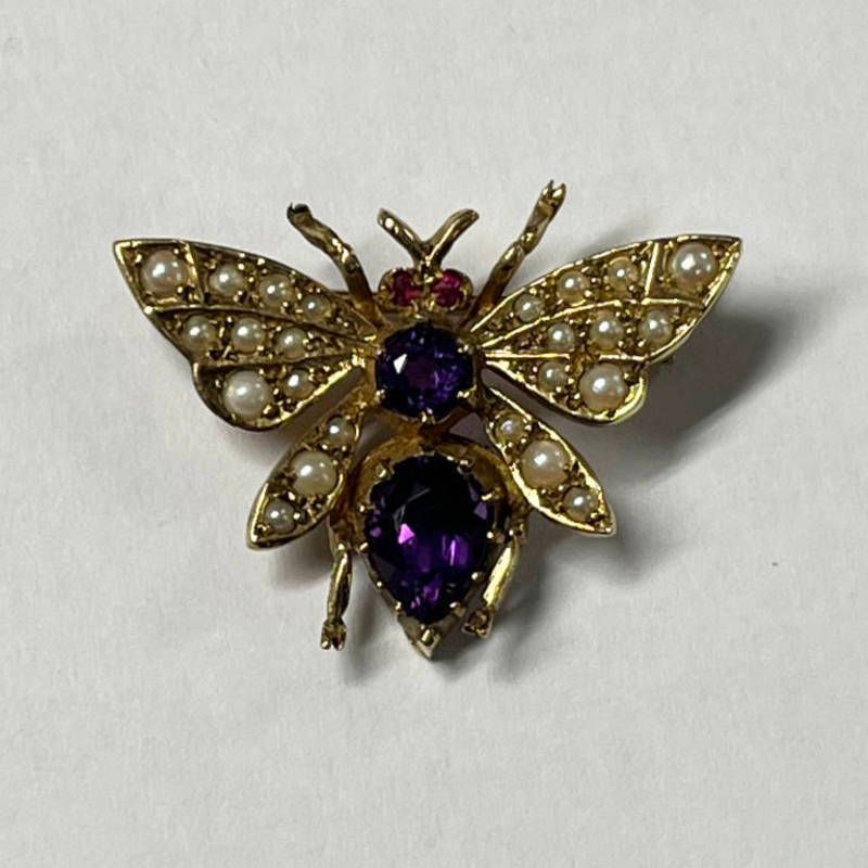 9ct gold seed pearl amethyst & ruby set bee brooch - 2.7 cm wide. 3.7g