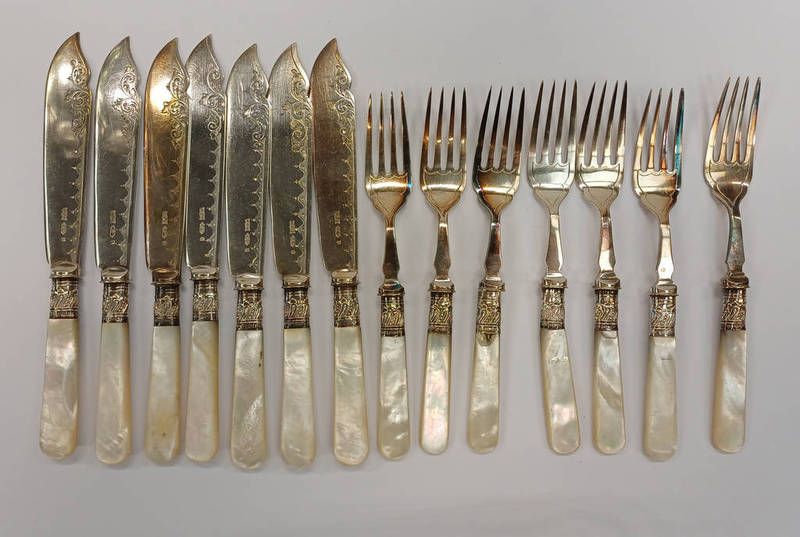 Set of 7 silver banded mother of pearl handled knives & forks