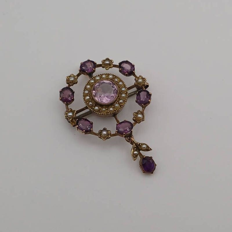 Early 20th century gold amethyst & seed pearl brooch/pendant. the central circular cut amethyst set within a surround of pearls & a further border of pearls & amethysts with a pearl & amethyst drop below, unmarked - 3cm diameter, 5.1g
