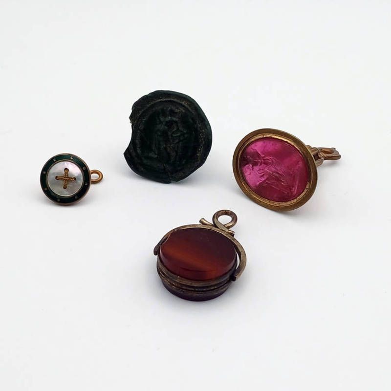 19th century swivel circular agate fob, gold plated carnelian set fob etc.
