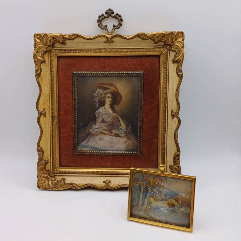 Framed miniature dolls house water colour of river scene, signed jackson simpson and framed miniature of duchess of devonshire, signed. 19.5 x 18 & 5.5 x 6.5 cm