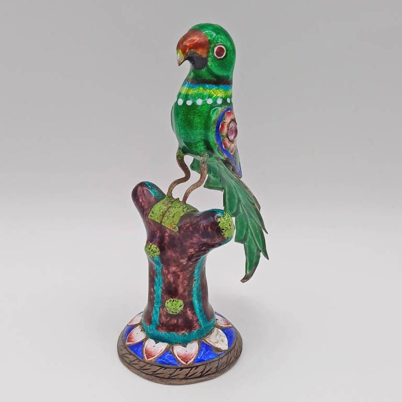 Eastern metal bird with enamelled decoration on enamelled circular base, 100 grams
