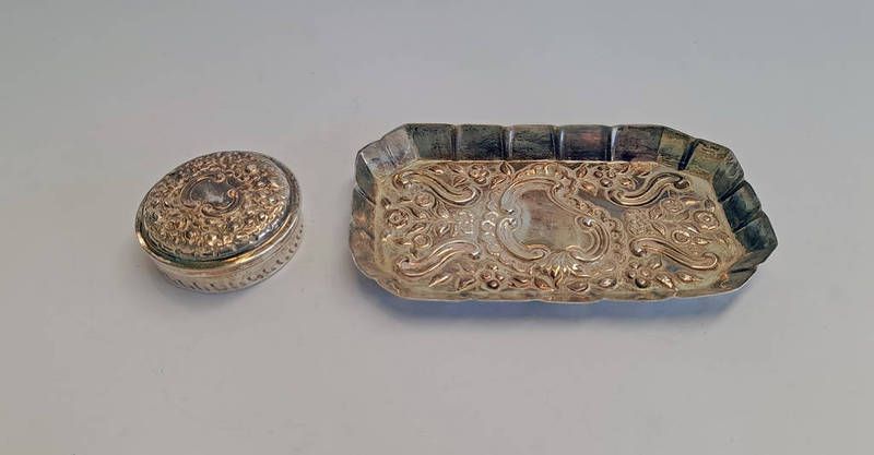 Victorian silver circular lidded trinket box by atkin bros, sheffield 1889, & silver oblong dish - 63g total