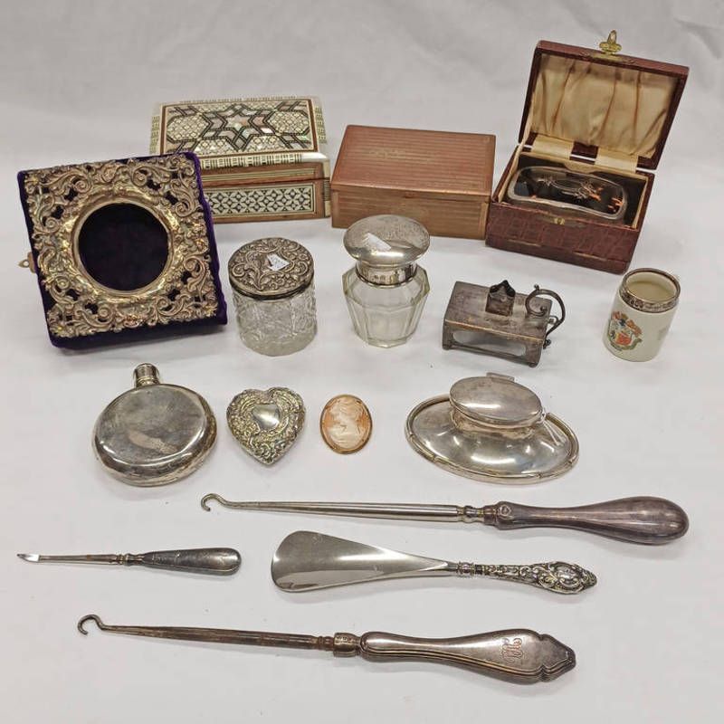 Selection of silver topped bottles silver watch holder, silver match holder, 2 silver handled button hooks, etc