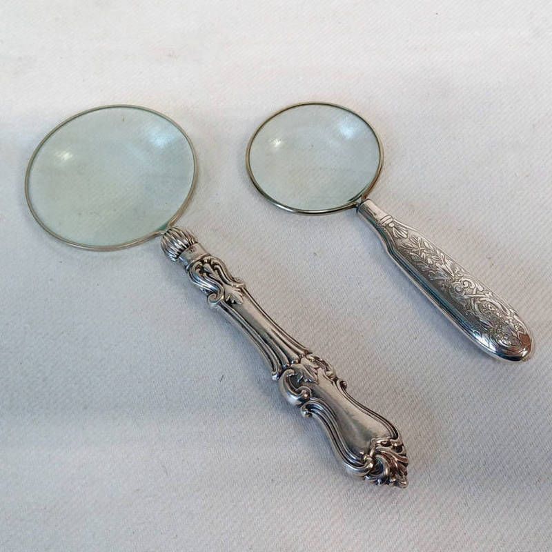 2 silver handled magnifying glasses