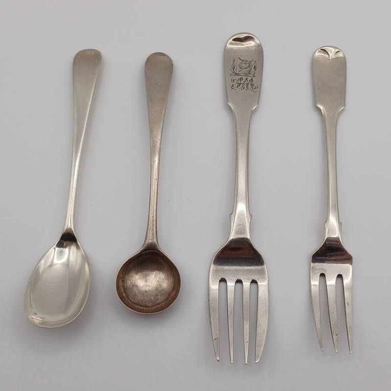 2 irish silver oyster forks, dublin 1820 & 1832 & 2 silver condiment spoons, 1 london 1909 & 1 with rubbed marks