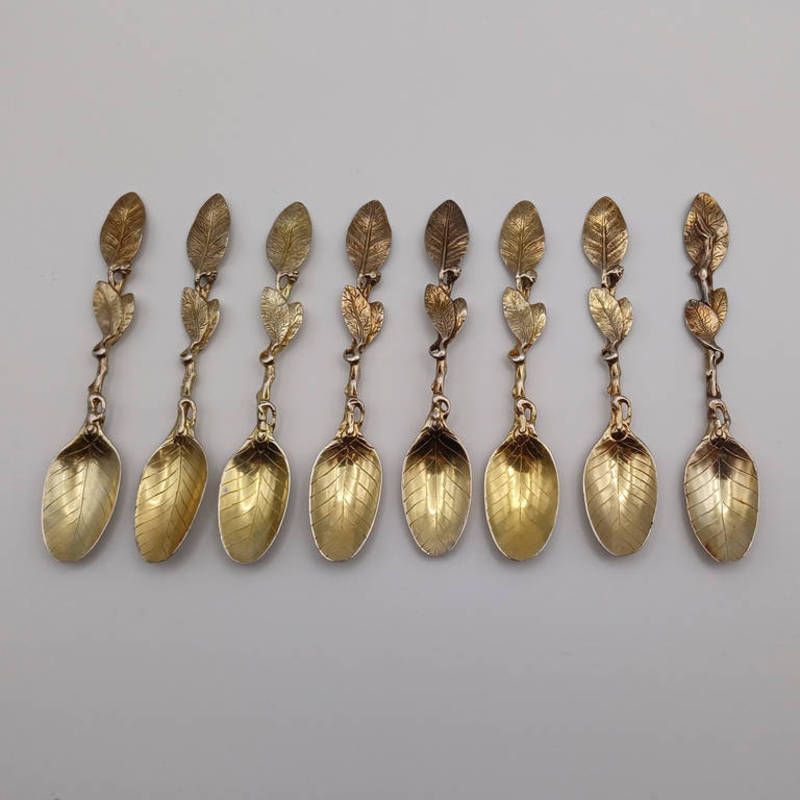 8 victorian silver gilt spoons in the form of leaves & branches by william stocken, london 18654 - 129 grams