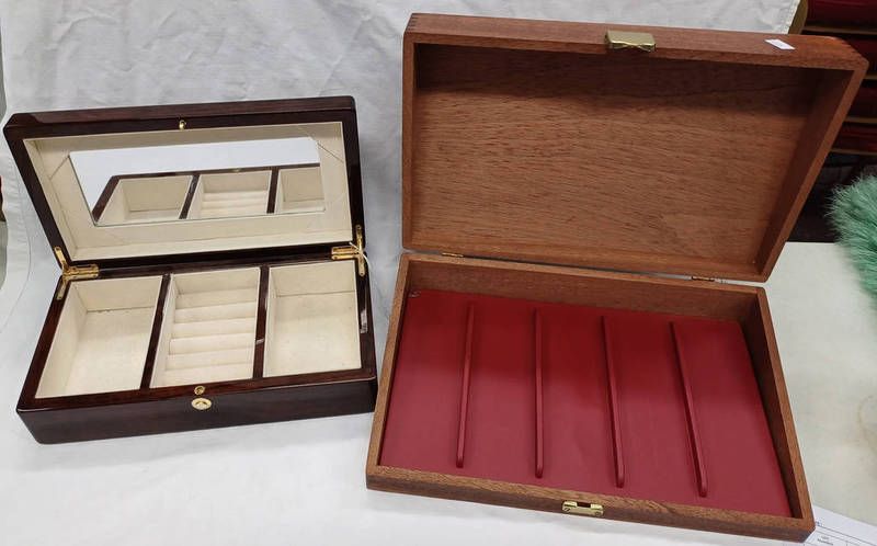 Jewellery box with fitted interior & mirrored top, 15 x 28 cms and mahogany box with plastic insert , 21 x 33 cms