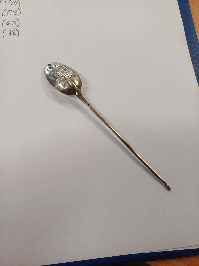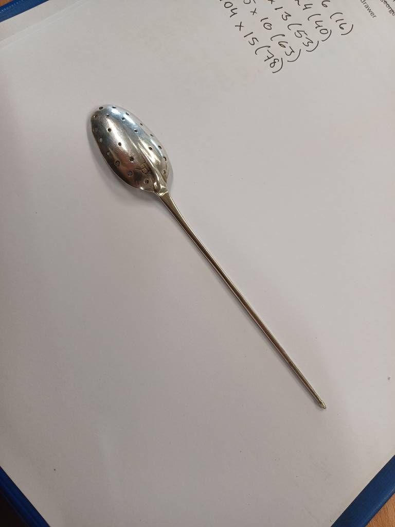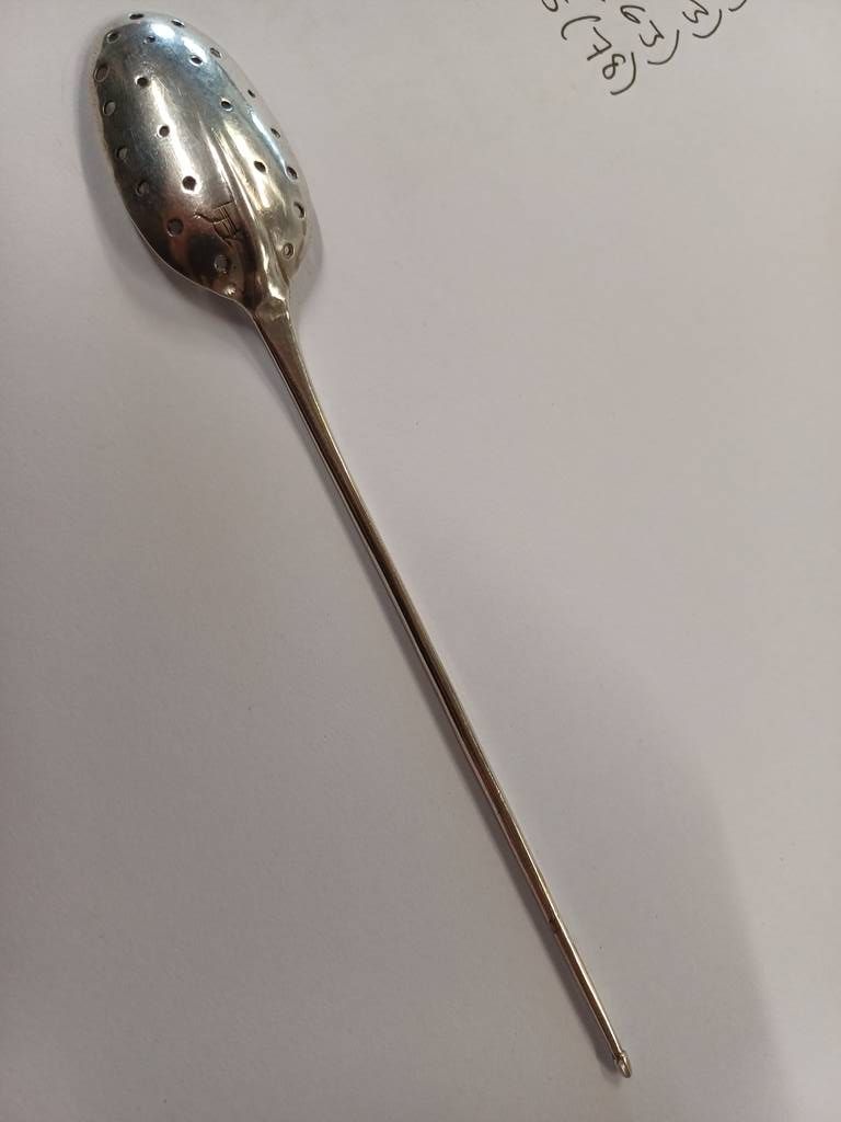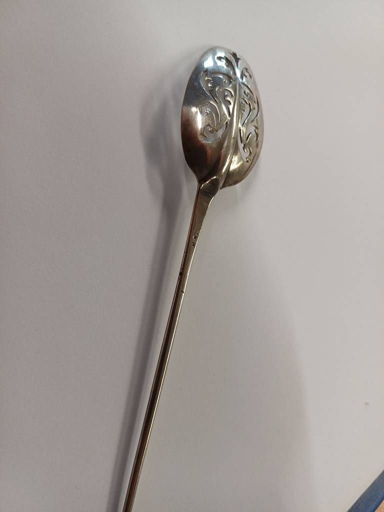 2 18th century silver mote spoons both with pierced bowls both with rubbed marks