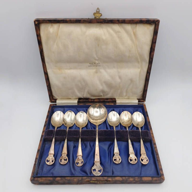 Cased set of 6 arts & crafts silver teaspoons with silver serving spoon with decorative terminal by enid kelsey, london 1932 - 100g