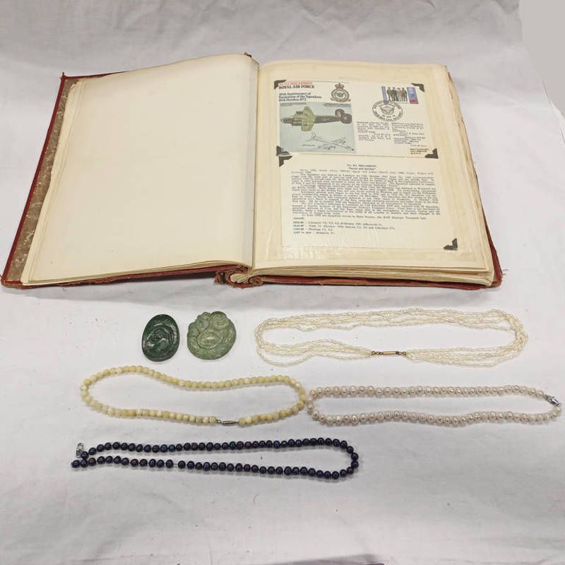 4-strand pearl necklace, 1 other pearl necklace, 2 oriental green hardstone plaques, stamp album, etc