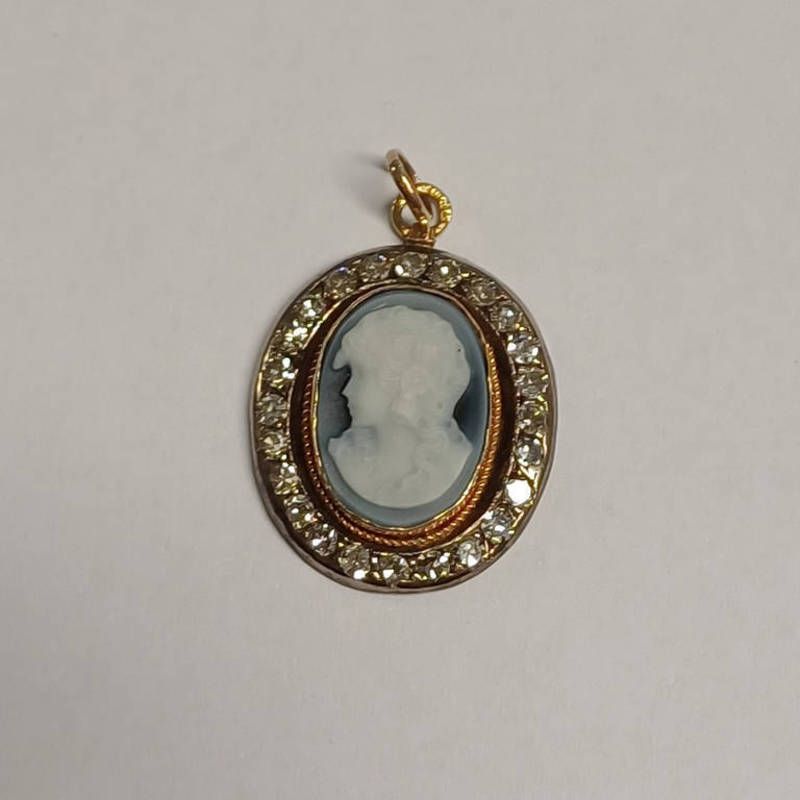 18ct gold cameo & diamond set pendant, the oval cameo depicting a lady in profile set within a surround of diamonds - 2.5cm long. 3.8g